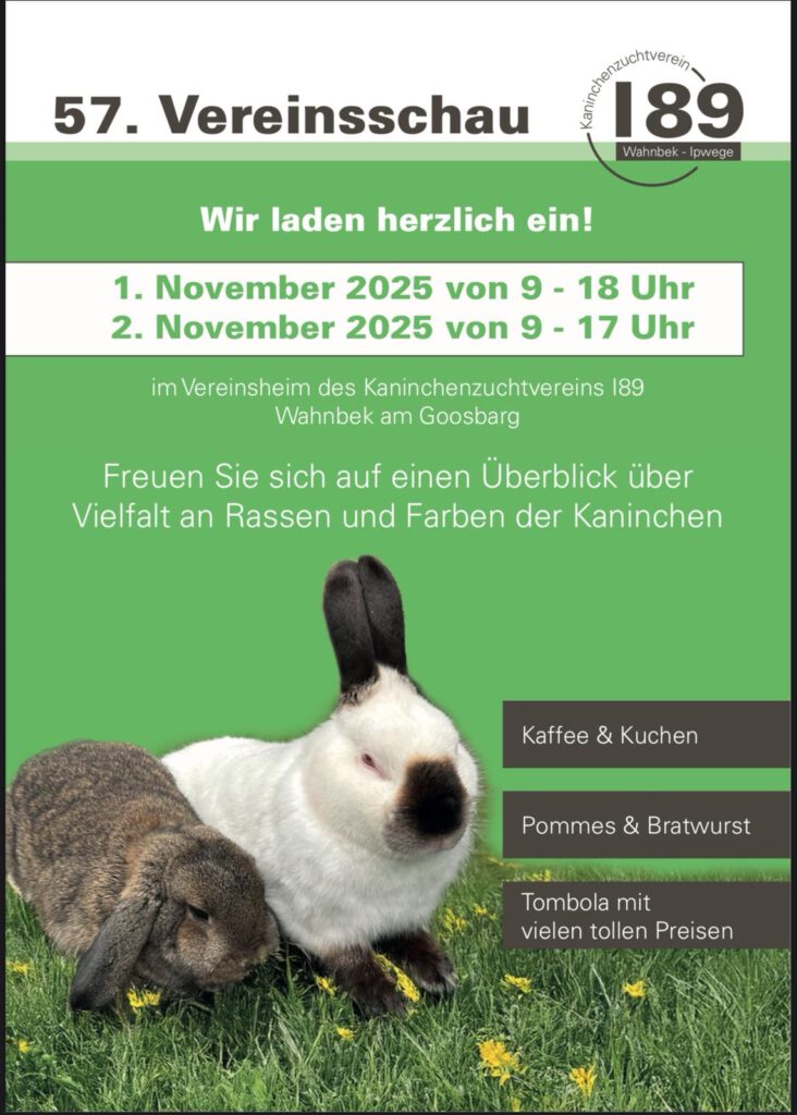 Wir freuen uns darauf dich an diesem Wochenende bei Uns im Vereinsheim willkommen zu heißen! Wir stellen dir unsere Kaninchen vor, haben eine großartige Tombola & die Mucki-Essbar ist immer einen Besuch Wert.